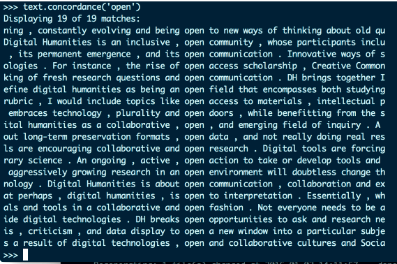 It definitely wasn’t the most commonly used word. The word “digital” appeared, not surprisingly, 613 times. Similarly, words like “humanities”, “technology”, and “computing” all occurred over 100 times. By contrast, the word “open” was used only 19 times. However, when I inspected the context of the word’s usage with the toolkit’s “concordance” algorithm a very striking pattern emerged: